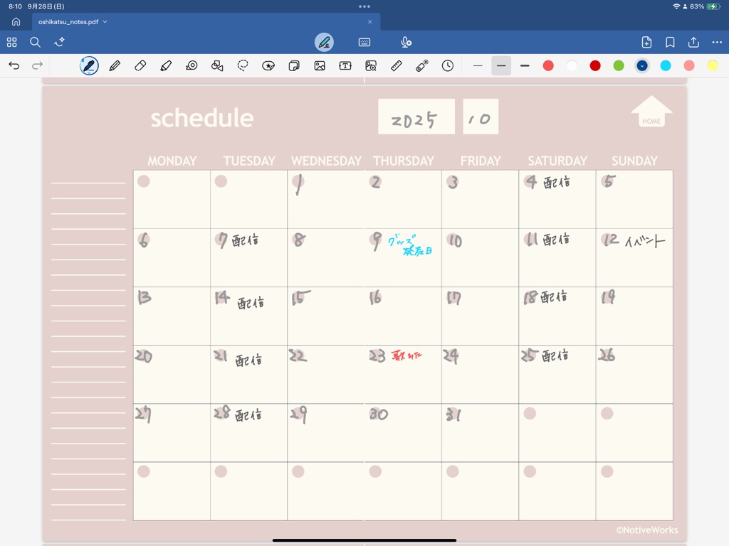 イベントや配信ライブの予定を書き込めます。自分で日付を書き込む万年カレンダーなのでいつでも始められます。